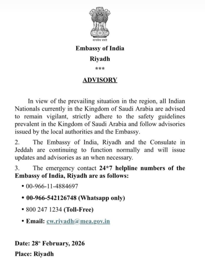 പ്രദേശത്ത് നിലനിൽക്കുന്ന സാഹചര്യം പരിഗണിച്ച്, നിലവിൽ സൗദി അറേബ്യയിൽ താമസിക്കുന്ന എല്ലാ ഇന്ത്യൻ പൗരന്മാരോടും ജാഗ്രത പാലിക്കാനും, സൗദി അറേബ്യൻ അധികാരികൾ പുറത്തിറക്കിയ സുരക്ഷാ മാർഗനിർദ്ദേശങ്ങൾ കർശനമായി പാലിക്കാനും, അതുപോലെ എംബസിയും പ്രാദേശിക അധികാരികളും നൽകുന്ന അറിയിപ്പുകൾ അനുസരിക്കാനും ആവശ്യപ്പെടുന്നു.