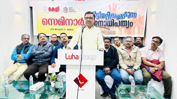 റിയാദ് : കേളി കലാസ്കാരിക വേദിയുടെ 12- ആം കേന്ദ്ര സമ്മേളനത്തിന് മുന്നോടിയായി അട്ടിമറിക്കപ്പെടുന്ന ജനാധിപത്യം’ എന്ന വിഷയത്തിൽ സെമിനാർ സംഘടിപ്പിച്ചു. സാംസ്ക്കാരിക കമ്മറ്റി അംഗം ഷബി അബ്ദുൾ സലാം മോഡറേറ്ററായ സെമിനാർ മലയാളം മിഷൻ സൗദി ചാപ്റ്റർ സെക്രട്ടറി ജോമോൻ സ്റ്റീഫൻ ഉദ്ഘാടനം ചെയ്തു.