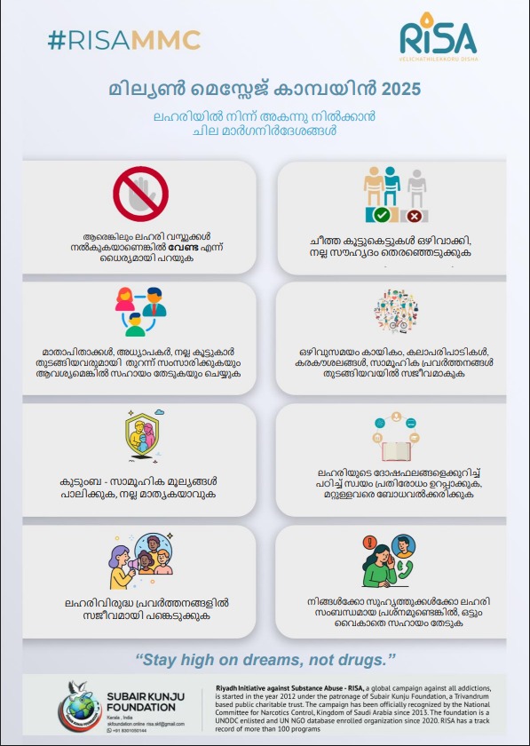അന്താരാഷ്ട്ര എൻ ജി ഓ സുബൈർ കുഞ്ഞു ഫൗണ്ടേഷന്റെ ലഹരിവിരുദ്ധ ബോധവത്കരണ പരിപാടി റിസയുടെ പതിമൂന്നാമത് ‘മില്യൺ മെസ്സേജ് ക്യാമ്പയിന് ‘ സമാപനമായി.