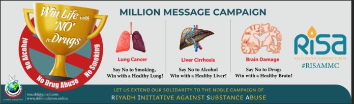 യു എൻ ഓ ഡി സി അംഗീകാരമുള്ള അന്താരാഷ്ട്ര എൻ ജി ഓ സുബൈർകുഞ്ഞു ഫൗണ്ടേഷന്റെ ലഹരിവിരുദ്ധബോധവൽക്കരണപരിപാടി- റിസയുടെ പതിമൂന്നാമത് ‘ദശലക്ഷം സന്ദേശ’ കാമ്പയിൻ ഗാന്ധിജയന്തിദിനമായ ഒക്ടോബർ 2-ന് ആരംഭിക്കും. ശിശുദിനമായ നവംബർ 14 – വരെയുള്ള ആറാഴ്ചക്കാലം നീണ്ടുനിൽക്കുന്ന ഇലക്ട്രോണിക് കാമ്പയിന്റെ ഭാഗമായി വിദ്യാഭ്യാസസ്ഥാപനങ്ങൾ, സാമൂഹികകൂട്ടായ്മകൾ, പ്രമുഖ വ്യക്തികളുടേതുൾപ്പെടെ വിവിധ സോഷ്യൽ നെറ്റുവർക്കുകൾ, വെബ്സൈറ്റുകൾ, ഹൈപ്പർ മാർക്കറ്റുകളുടെ ബ്രോഷറുകൾ തുടങ്ങിയവയിലൂടെ ലഹരിവിരുദ്ധ ഫ്ലയറുകളും ലീഫ്ലെറ്റുകളും പ്രചരിപ്പിക്കും. വ്യത്യസ്ത ഭാഷകളിൽ തയാറാക്കിയിട്ടുള്ള റിസയുടെ ലഘു ലേഖകളും ഹ്രസ്വചിത്രവും വിവിധ രാജ്യങ്ങളിൽ വ്യാപകമായി പ്രചരിപ്പിക്കും.